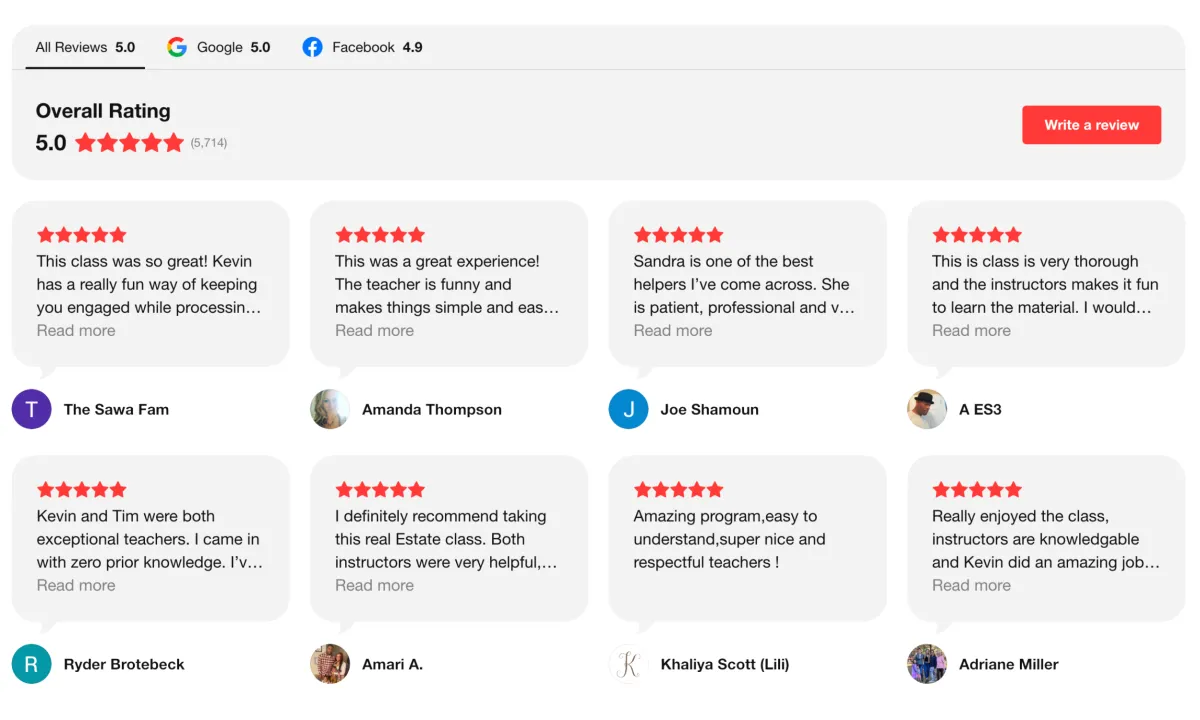 We are proud to have over 5000+ 5-star reviews, reflecting our commitment to serving the needs of our students. Our goal is to provide comprehensive knowledge and education in Real Estate Selling, Buying, Managing, and Appraising.